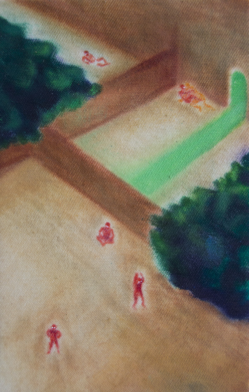 Un ensemble de tableaux miniatures multicolores, pas plus grands que des cartes à jouer, tapisse les murs. Leur taille séduisante nous attire vers un domaine onirique dans lequel des personnages sans traits sont suspendus contre des fonds ressemblant à des aubes et crépuscules incandescents. Débordantes d’intrigues, les toiles nous refusent la satisfaction d’un récit limpide. Elles oscillent entre différents degrés de lisibilité, nous invitent à nous oublier dans leur monde mystique avant de refondre dans le pigment brouillé.